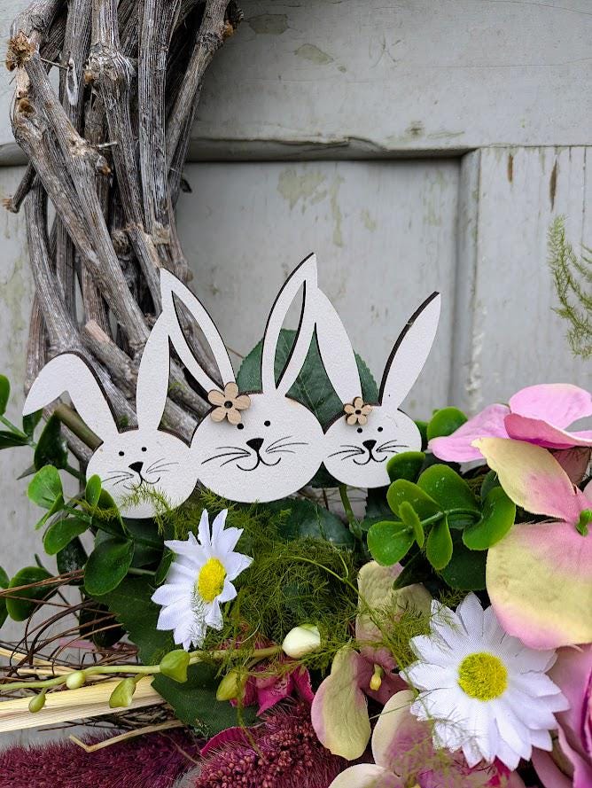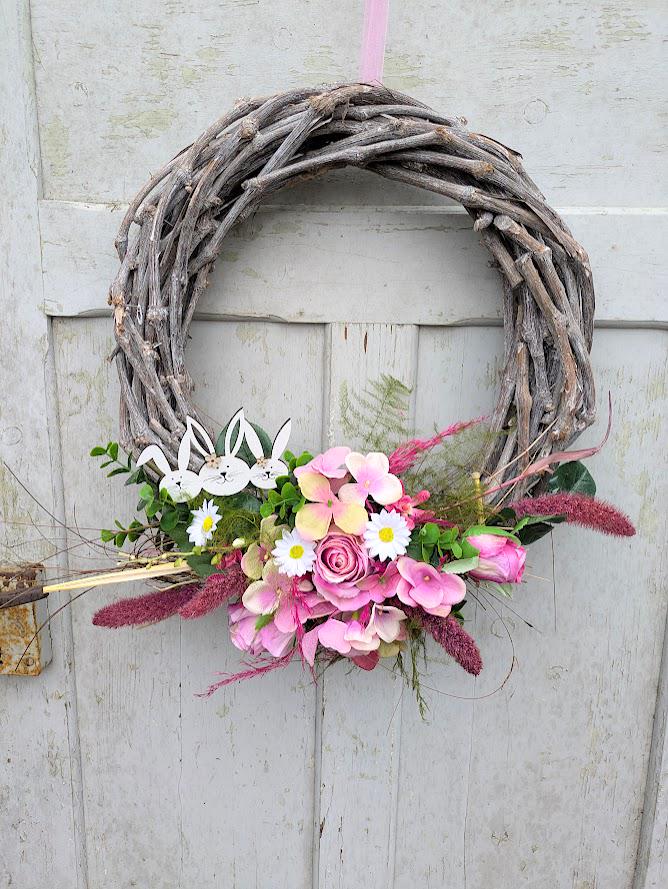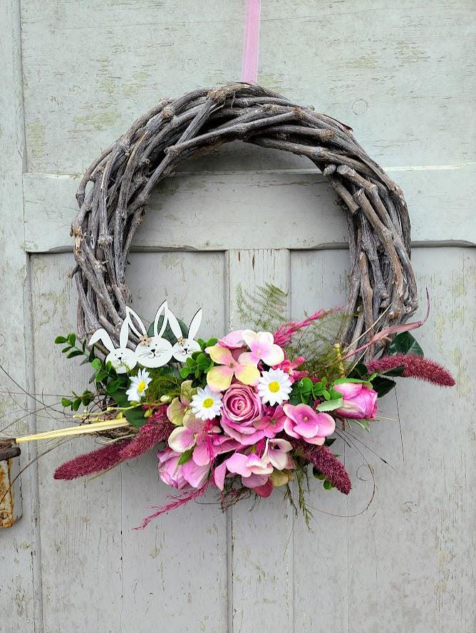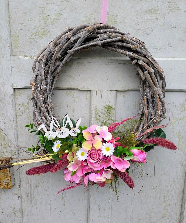 sowie aus Hochwertigen fast echt wirkenden verschiedenen Künstlichen Blumen wie Rosen, Eukalyptus, Blattgrün. Ostern Hoop und ein Hasenstecker