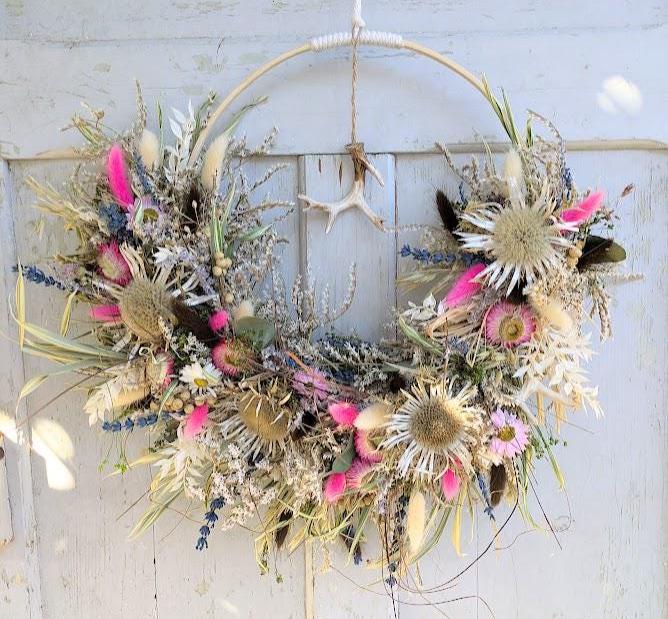Dieser bezaubernde Türkranz ist ein wahrer Blickfang für Ihr Zuhause. Auf einem stabilen Bambusring gebunden, vereint er eine Vielzahl von getrockneten Materialien und verleiht jedem Eingangsbereich eine einladende Note.
