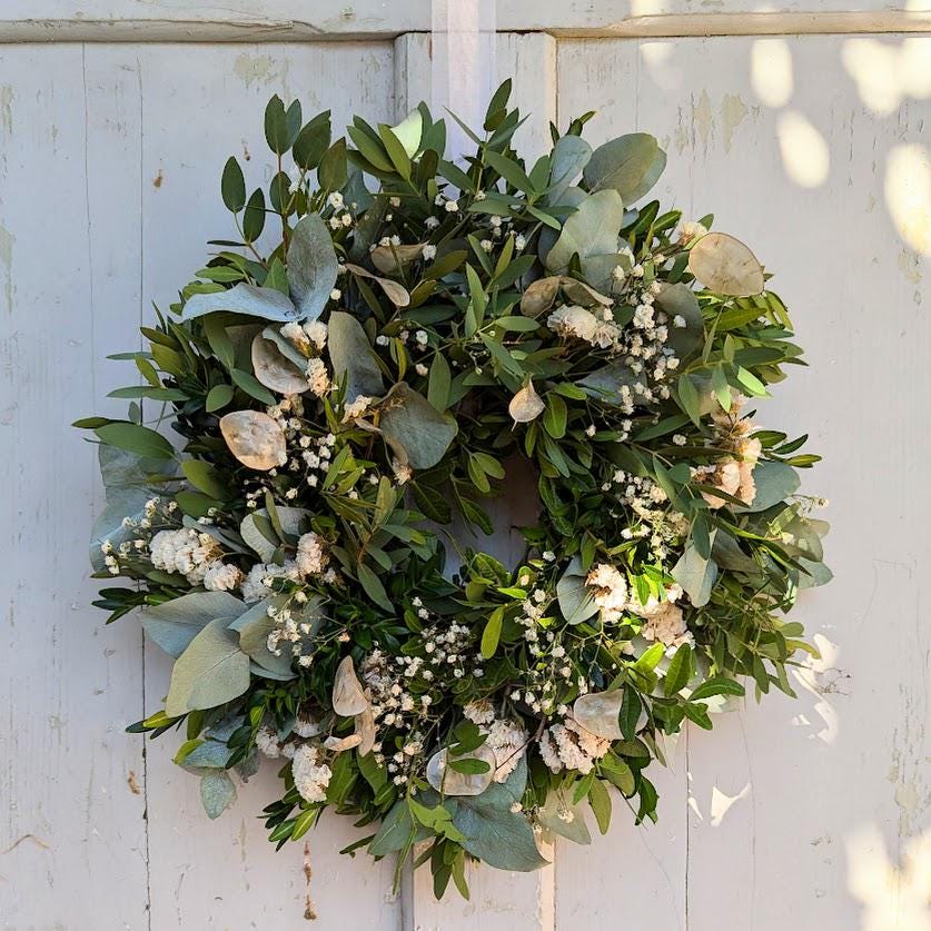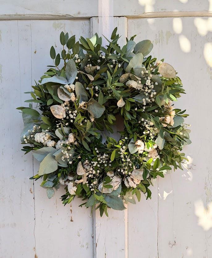 der Kranz wird aus frischen und getrockneten Materialien gebunden am Tag des Versands.
