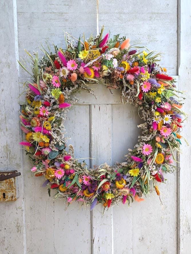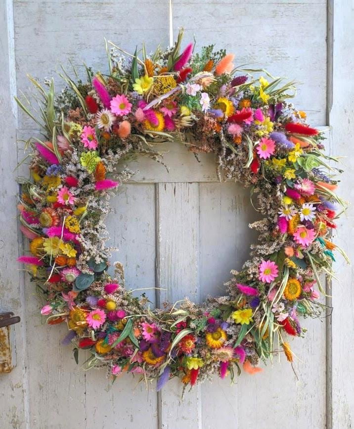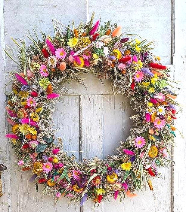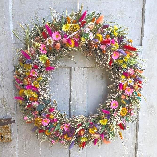 Material: Der Kranz besteht aus einer sorgfältigen Auswahl an Trockenblumen und künstlichen Blumen.