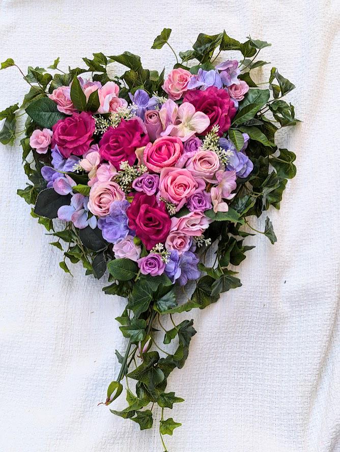 Das Herz besteht aus hochwertigen künstlichen Materialien, darunter verschiedene Seidenhortensien und Rosen in unterschiedlichen Farbtönen, die eine lebendige und ansprechende Optik bieten. Umrahmt von zartem Efeu, vermittelt das Herz ein Gefühl von Frische und Natürlichkeit