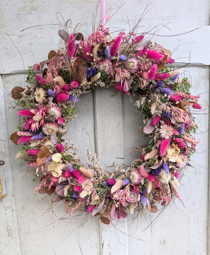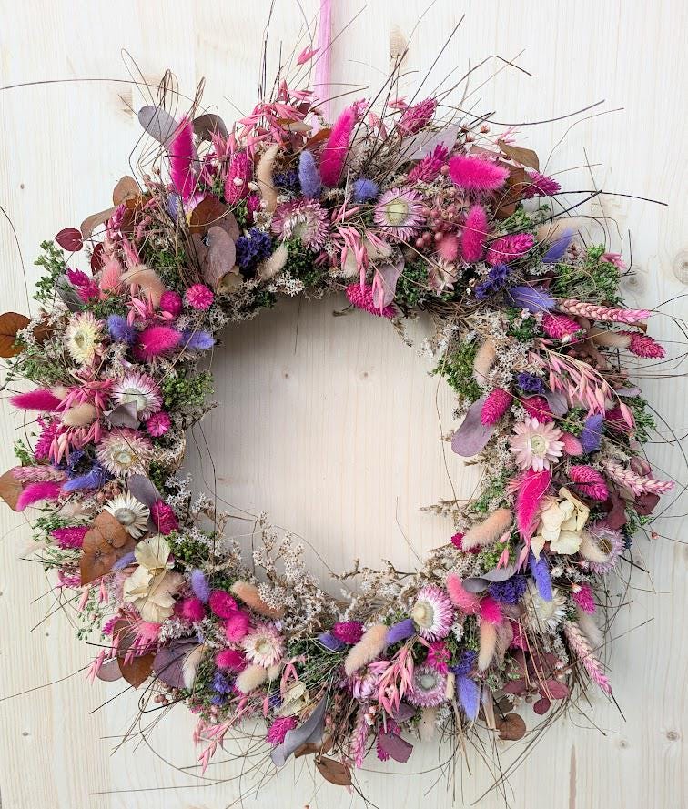 **Material:** Der Kranz besteht aus einer sorgfältigen Auswahl an Trockenblumen und wird gebunden mit vielen verschiedenen getrockneten Materialien Reißig, Glixia, Tatarica, Gräßer, Lagurus, Strohblumen, Pfefferkörner.