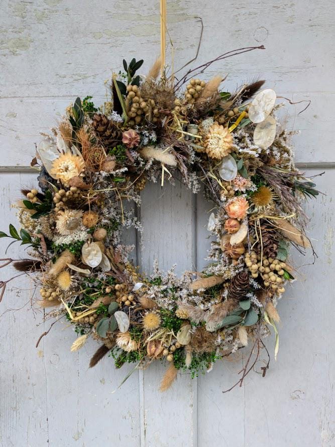 der Kranz wird frisch nach einer sorgfältigen Auswahl an Trockenblumen auf einem stabilen Metallring gebunden. Verwendete Materialien getrocknete Tatarica, Gräser, Reißig, Lagurus, Zapfen, Beeren, Bambus getrockneter Eukalyptus etwas frischer Buchs der eintrocknet und Strohblumen.