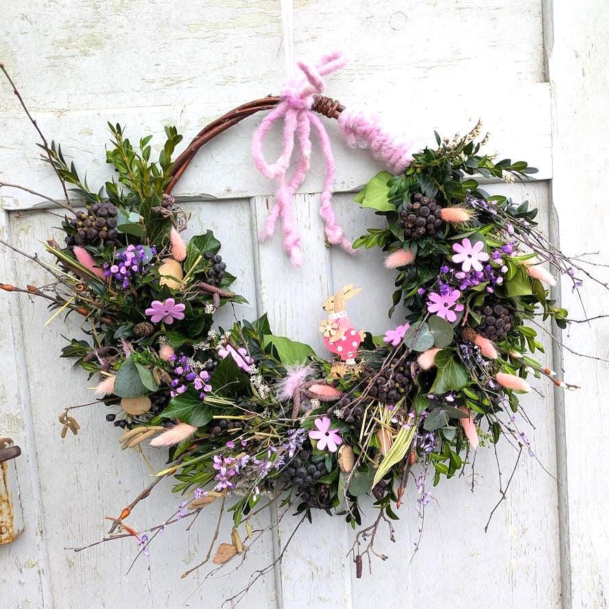 schöne Handarbeit mit viel Liebe von Hand gebunden mit frischem Eukalyptus, Heidelbeere , Efeublätter und Beeren ,Schleierkraut und Ginster, Erle, Birkenreißig, die natürlich eintrocknen und immer noch wochenlang schön aussehen. Mit eingebunden werden getrockneter Tatarika, Lagurus, Helichrysum und ein Wollband ziert diesen schönen Frühlings Hoop