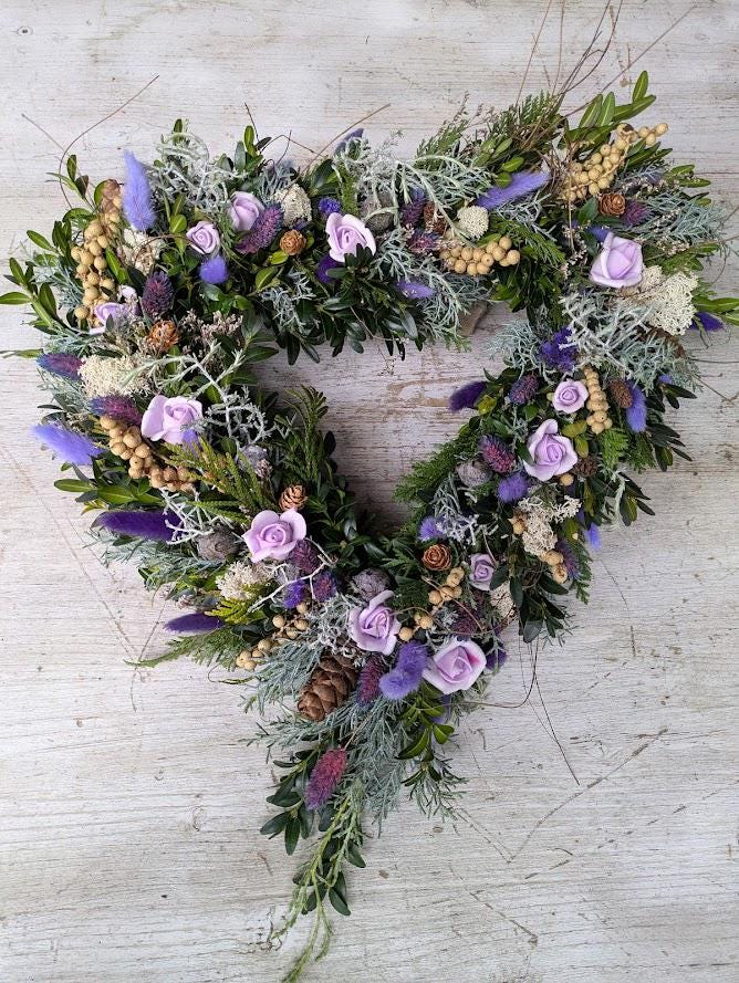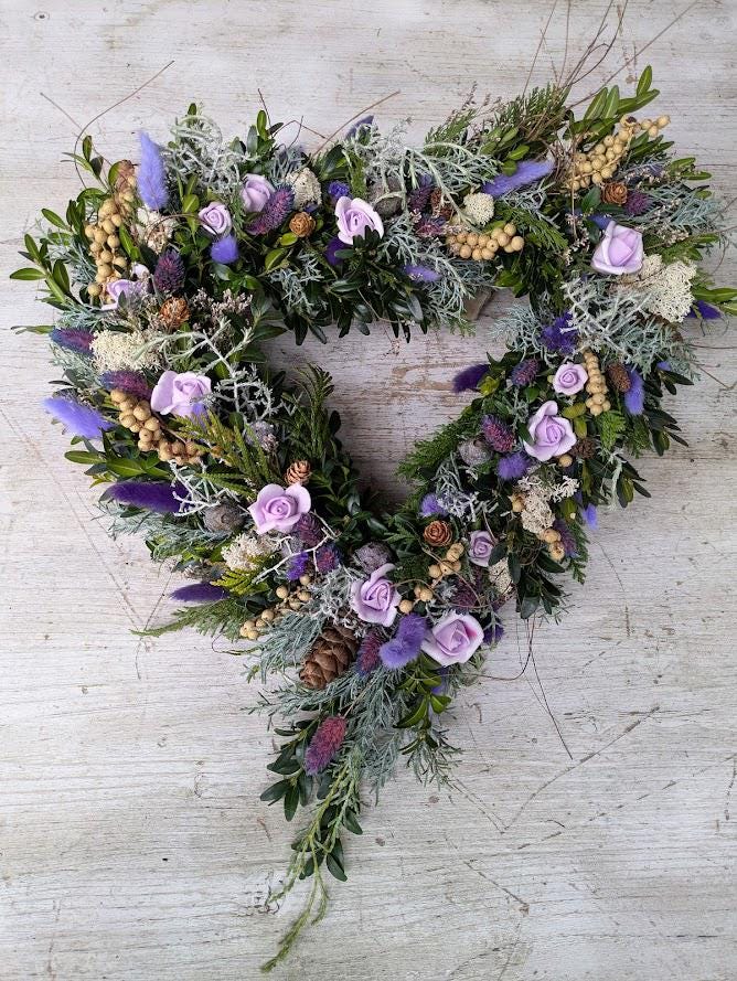 gebunden vielen verschiedene frischen Grün wie Buchs verschiedene Koniferen, Trockenblumen, Tannenzapfen, Beeren Kokus, Selektgraß, Ligarus sowie künstliche Schaumröschen zum Legen oder hängen