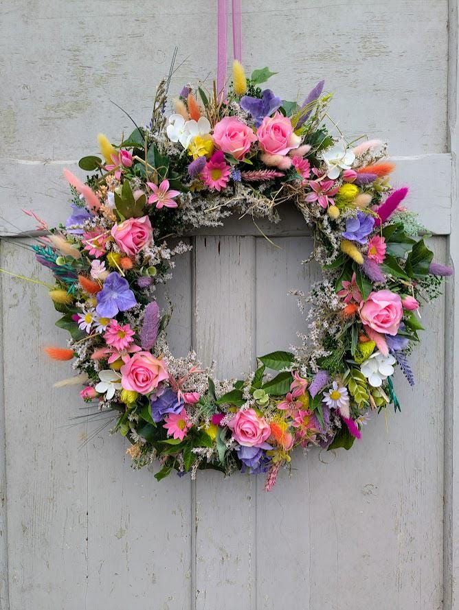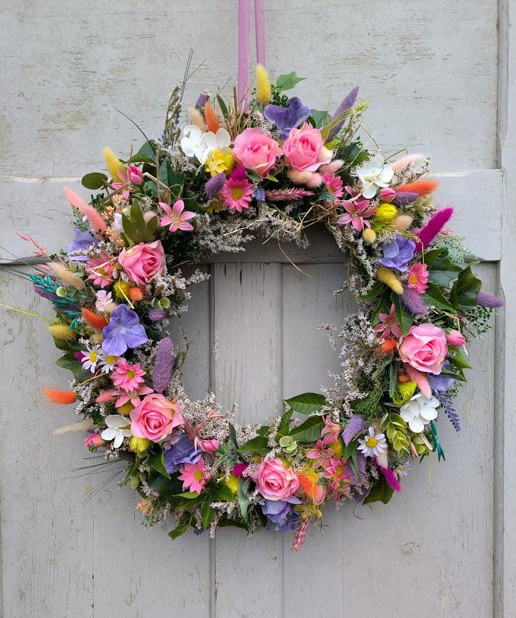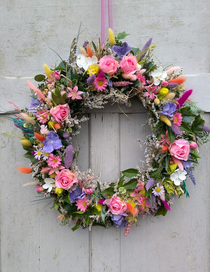 Material: Der Kranz besteht aus einer sorgfältigen Auswahl an Trockenblumen und künstlichen Blumen.
