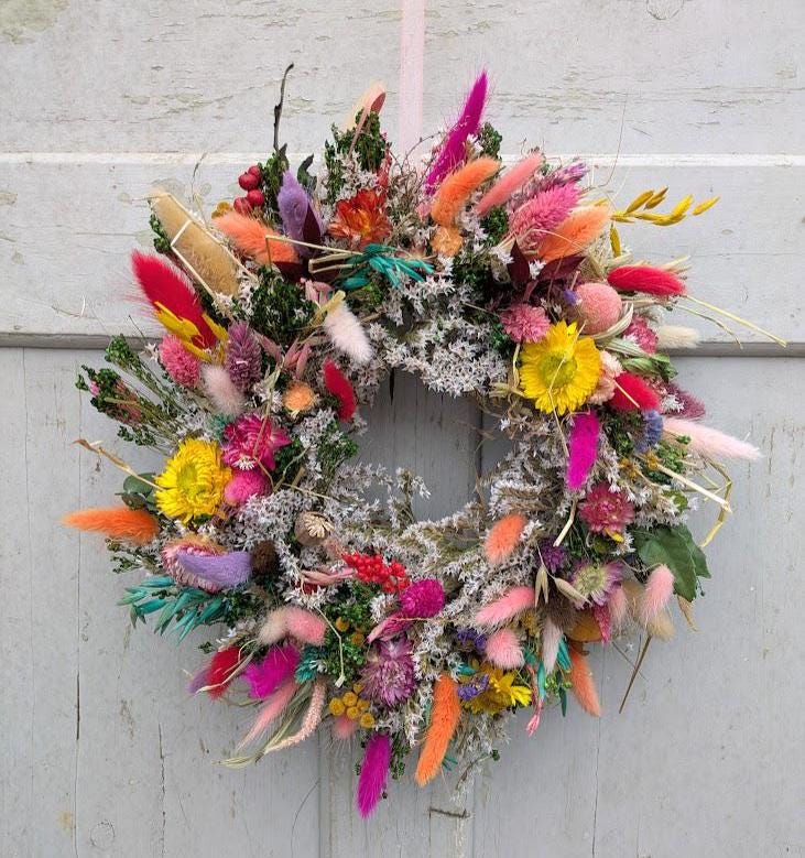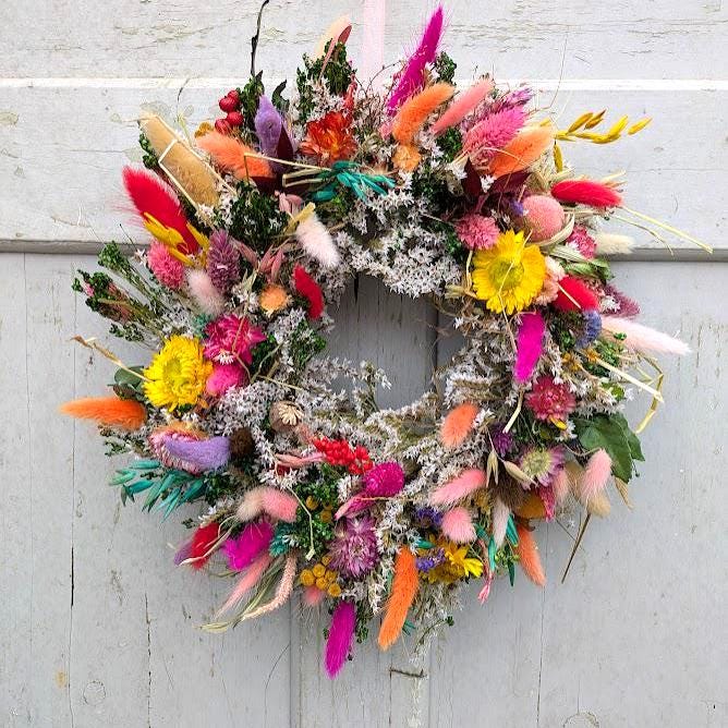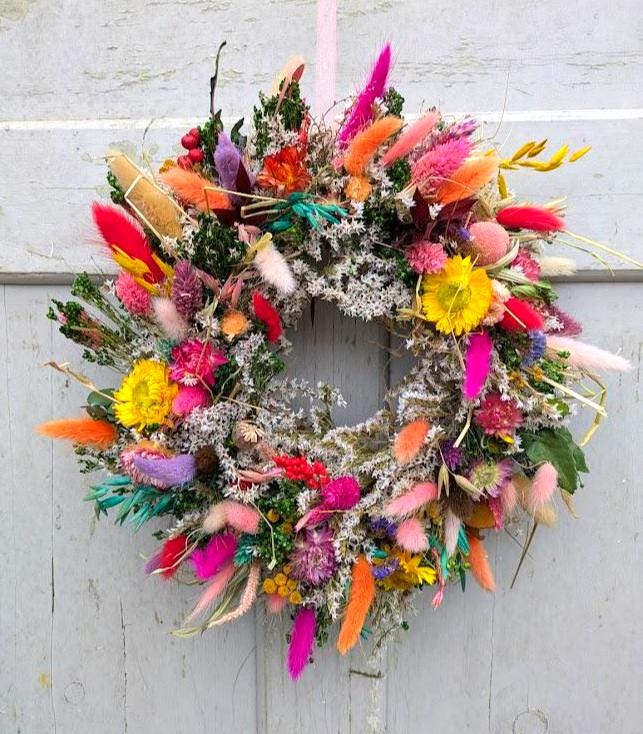 der Kranz wird frisch nach einer sorgfältigen Auswahl an Trockenblumen auf einem stabilen Metallring gebunden. Verwendete Materialien Tatarica, Gräser, Lagurus, Hafer, Sisal und Strohblumen.