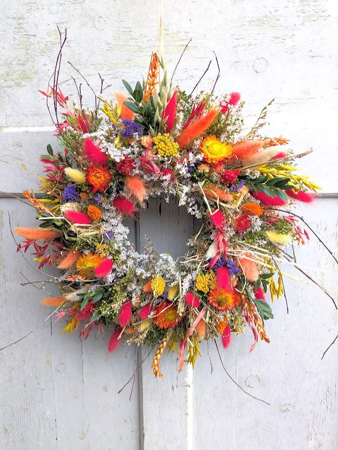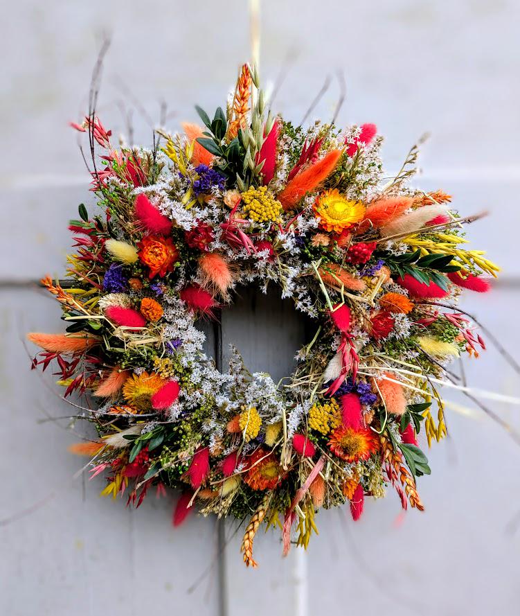 der Kranz wird frisch nach einer sorgfältigen Auswahl an Trockenblumen auf einem stabilen Metallring gebunden. Verwendete Materialien Tatarica, Gräser, Lagurus, Eukalyptus und Strohblumen.