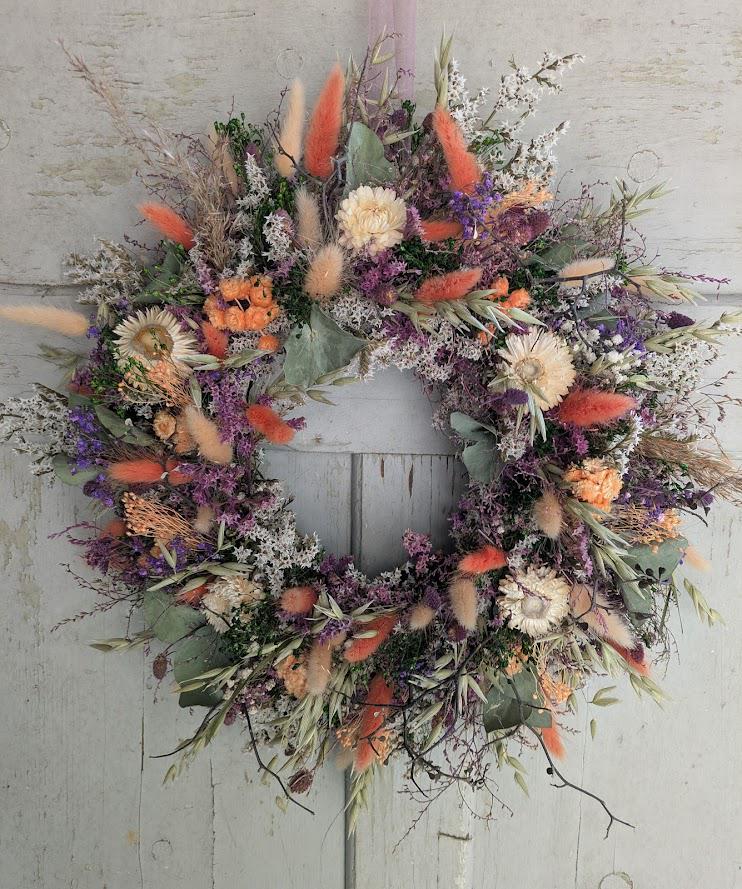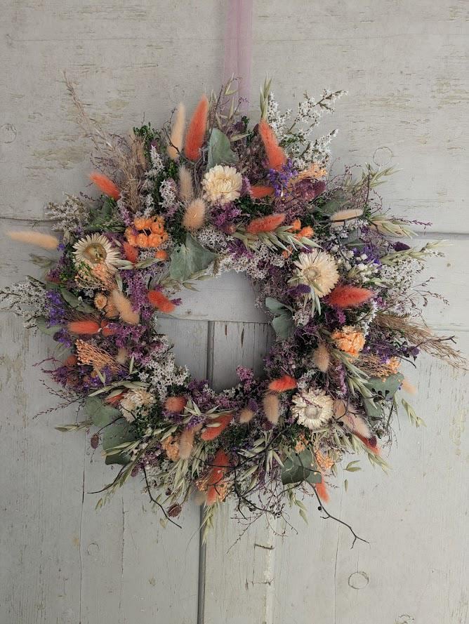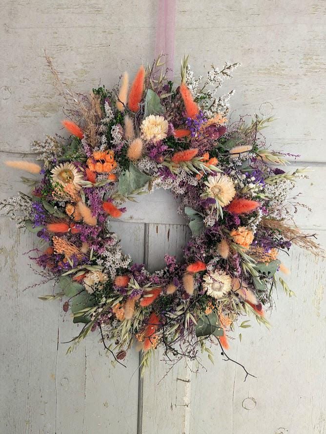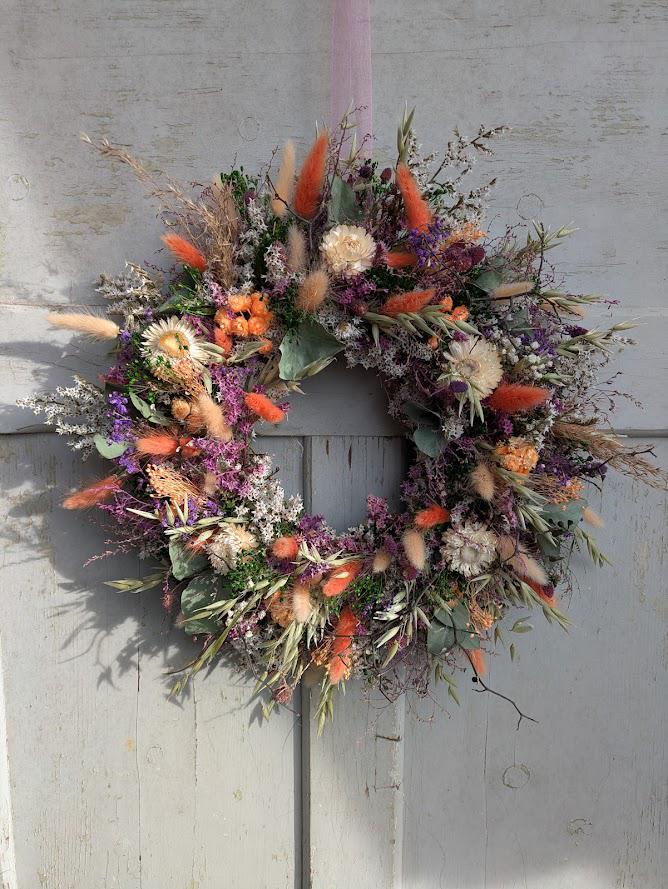 Der Kranz besteht aus einer sorgfältigen Auswahl an Trockenblumen und wird auf einem Metallring gebunden. Verwendete Materialien Tatarica, Gräser, Lagurus, Perlweis, Eukalyptus und Strohblumen .