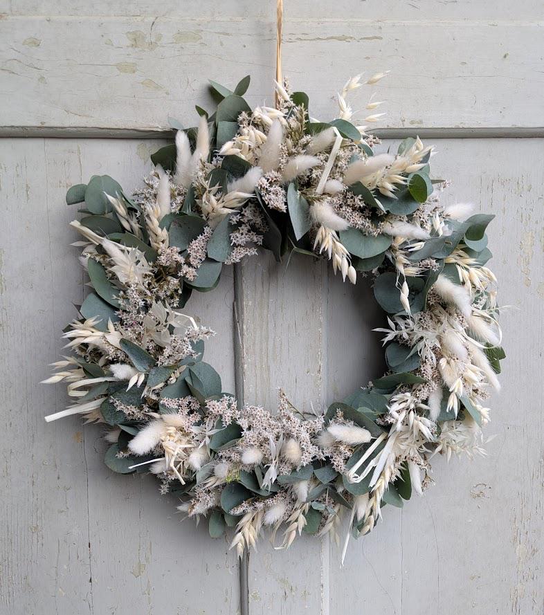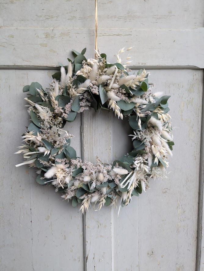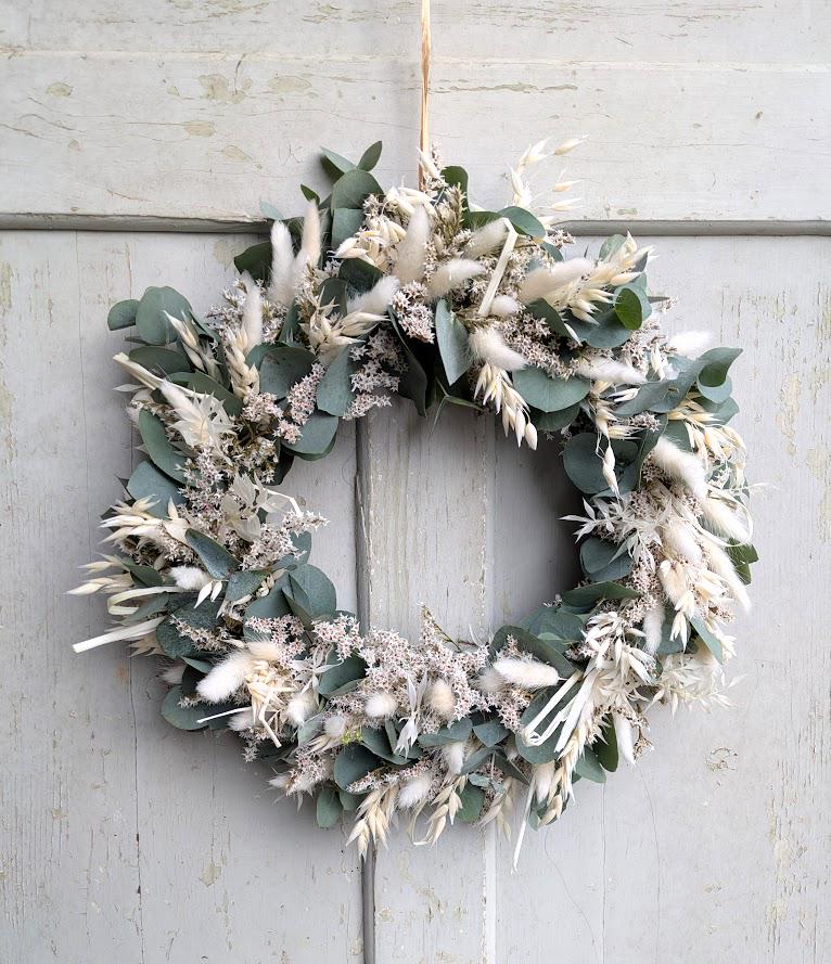 Der Kranz besteht aus einer sorgfältigen Auswahl an Trockenblumen und wird auf einem Metallring gebunden. Verwendete Materialien Tatarica, Gräser, Lagurus und echtem frischer Eukalyptus der langsam eintrocknet und immer noch schön aussieht..