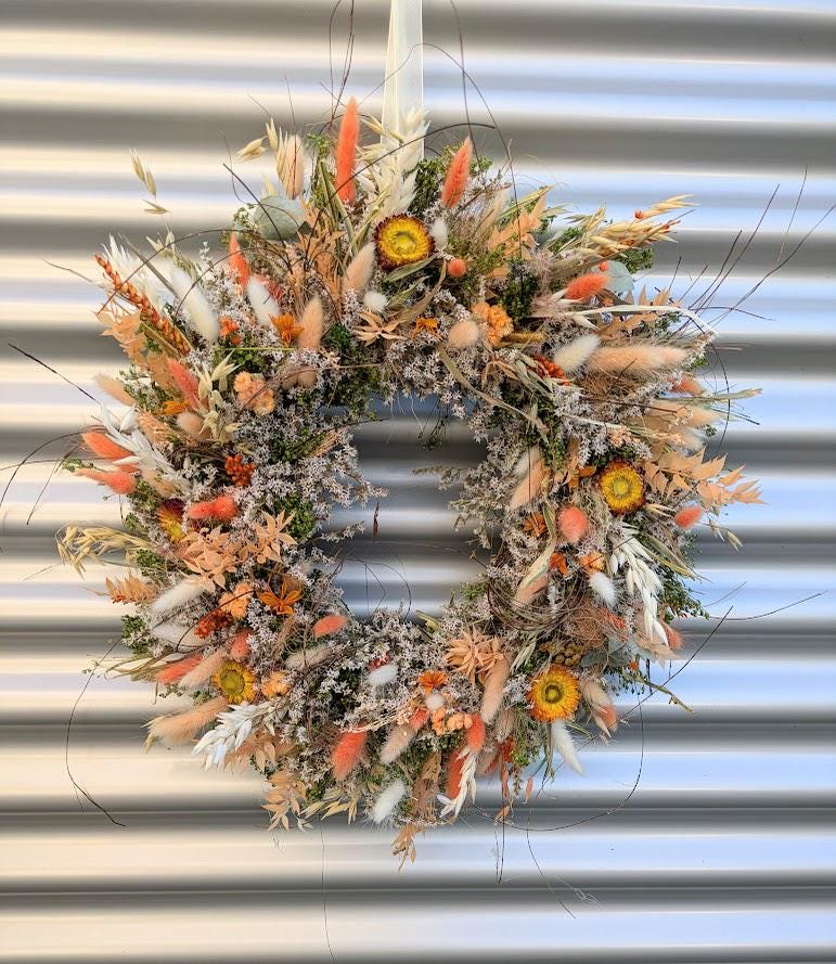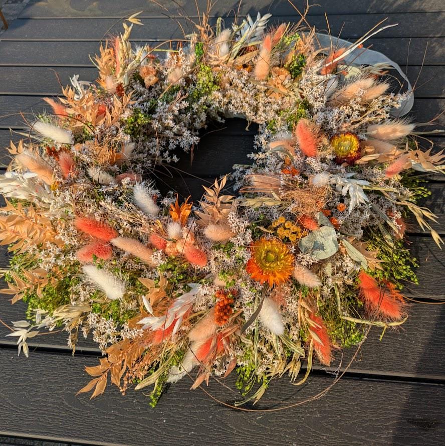 gebundenen auf einem Metallring mit vielen verschiedenen getrockneten Materialien Strohblumen, Bambus, Kräuter, Gräßer, Lagurus, Hafer, Ruskus, Nigela und Staticien.