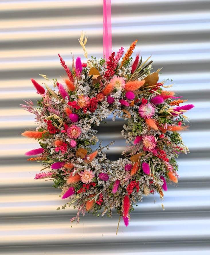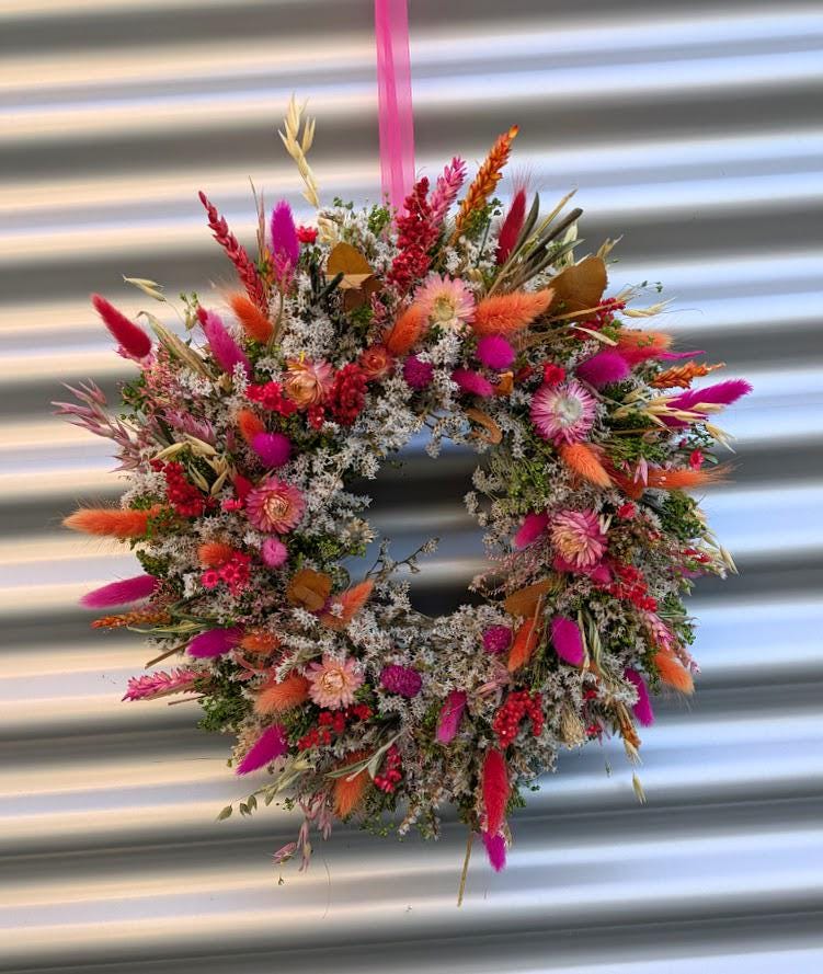 der Kranz wird frisch nach einer sorgfältigen Auswahl an Trockenblumen auf einem stabilen Metallring gebunden. Verwendete Materialien Tatarica, Gräser, Reißig, Kokus, Lagurus, Ruskus, Hafer, Eukalyptus und Strohblumen.