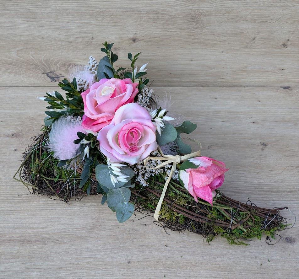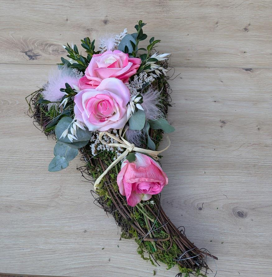 Materialien wie Moos künstliche Rosen, Federn echter Eukalyptus und Trockenblumen.