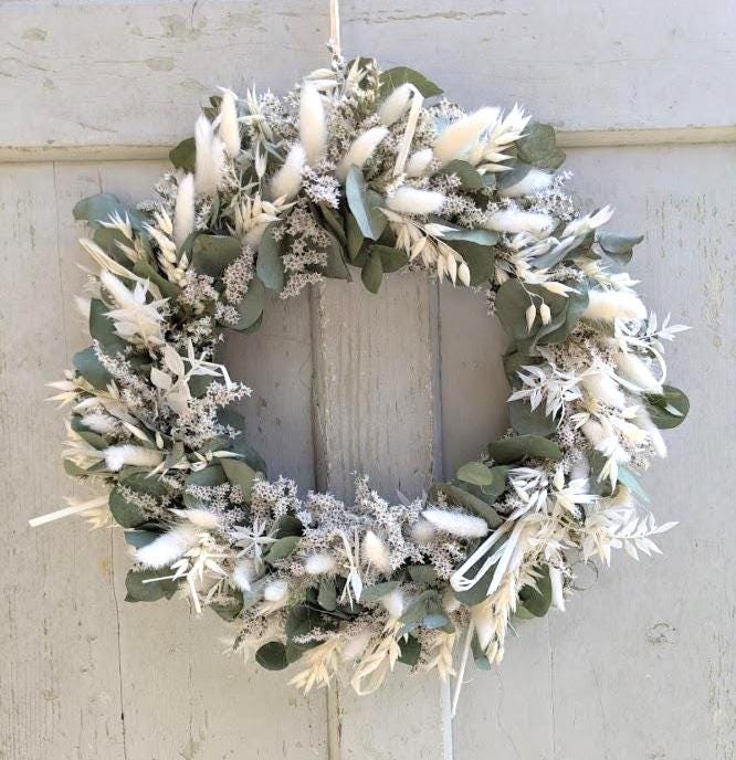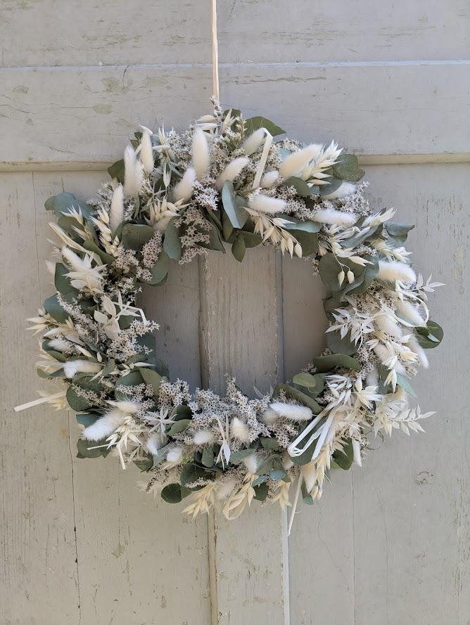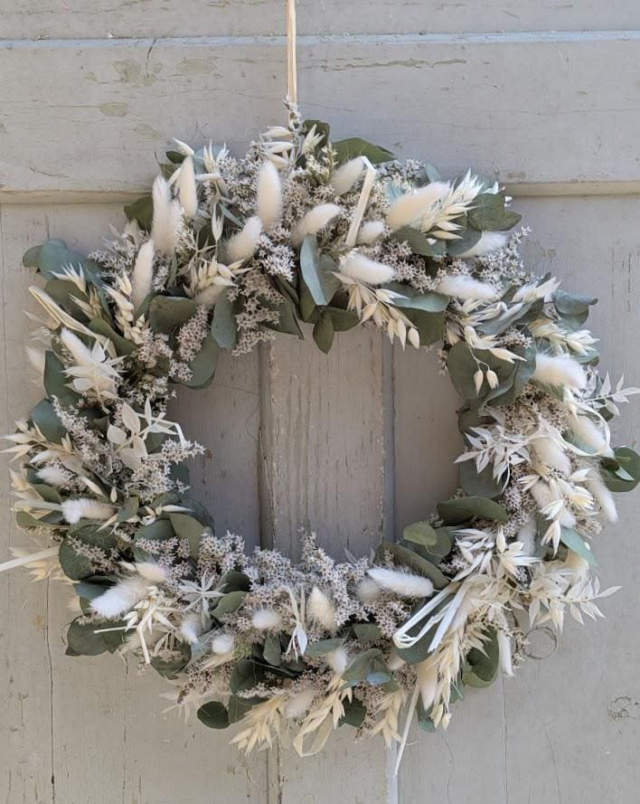 Der Kranz besteht aus einer sorgfältigen Auswahl an Trockenblumen und wird auf einem Metallring gebunden. Verwendete Materialien Tatarica, Gräser, Lagurus und Eukalyptus.