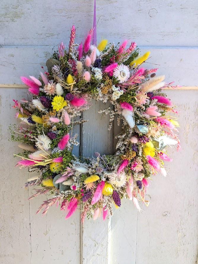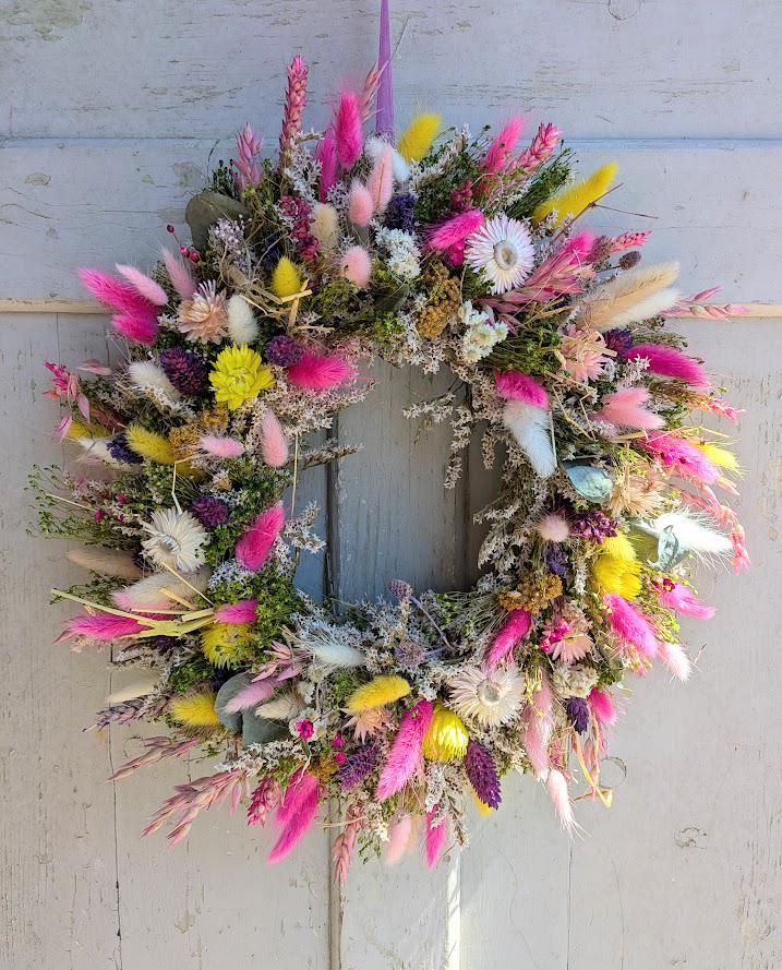 **Material:** Der Kranz besteht aus einer sorgfältigen Auswahl an Trockenblumen und wird auf einem stabilen Metallring gebunden. Verwendete Materialien Lagurus, Staticie, Eukalyptus, Tatarica, Hafer, Strohblumen, Gräser, Heu und Eukalyptus.